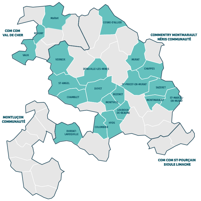 (Bézenet, Chamblet, Chappes, Colombier, Cosne d’Allier, Deneuille les Mines, Doyet, Durdat-Larequille, Haut Bocage mais uniquement Maillet, Hyds, Louroux de Beaune, Montmarault, Montvicq, Murat, Reugny, St Angel, St Marcel en Murat, St Priest en Murat, Sazeret, Vaux, Verneix)